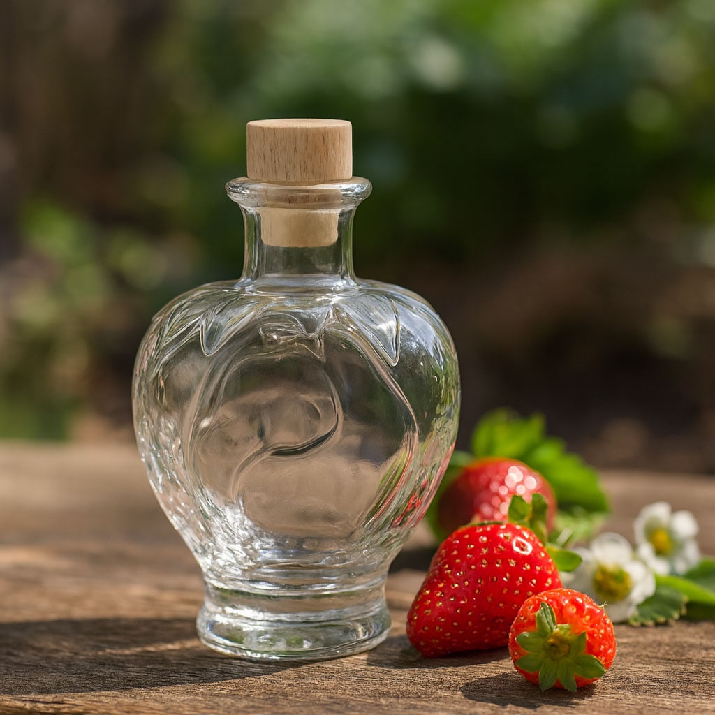 Butelka z motywem „Truskawka” zachwyca swoim uroczym, szczegółowym wzornictwem i przenosi słodycz oraz świeżość popularnego letniego owocu do eleganckiej szklanej formy. Wykonana z wysokiej jakości przezroczystego szkła, doskonale nadaje się do wykwintnych alkoholi wysokoprocentowych, owocowych destylatów lub wyśmienitych likierów. Harmonijnie ukształtowana powierzchnia przypomina naturalną teksturę truskawki, czyniąc butelkę prawdziwą ozdobą. Dzięki korkowemu zamknięciu zawartość można bezpiecznie i stylowo zabezpieczyć.
