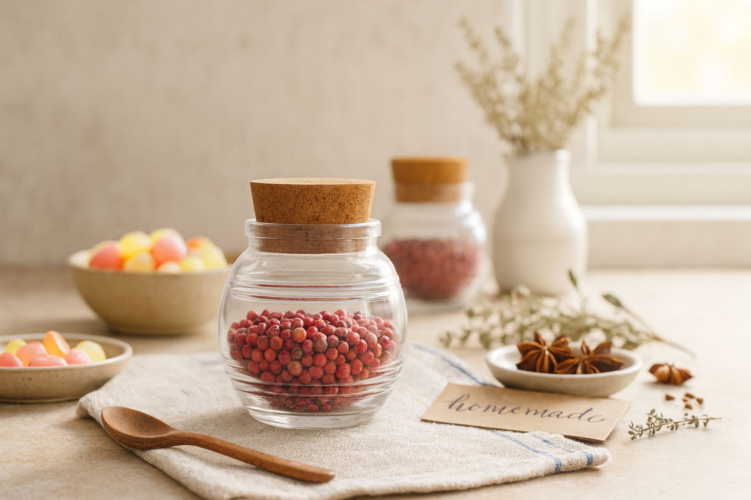 Seria „Jule” łączy estetyczną elegancję z praktyczną funkcjonalnością, oferując stylowe rozwiązanie do przechowywania przypraw, cukierków i innych wykwintnych smakołyków. Kulkowate szklane naczynie z korkiem wyróżnia się delikatnie zaokrąglonym kształtem oraz charakterystycznym reliefem w paski, który nadaje mu wyjątkową fakturę i nostalgiczny urok. Okrągła podstawa zapewnia harmonijny wygląd, a korek umożliwia bezpieczne i naturalne zamknięcie. Jule to nie tylko praktyczne szkło do przechowywania, ale także dekoracyjny akcent, który podkreśli każdą kuchnię lub stół.
